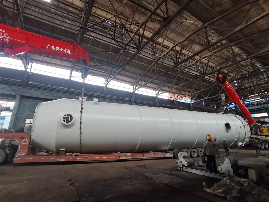 制造過程中,壓力容器制造廠在項目制造周期短、施工人力資源緊張的情況下,認真組織技術骨干進行施工,全力以赴順利按需完成了項目的交付任務。其中,空冷塔容積直徑4.2m,高(長)28.3m,重量約65噸;水冷塔直徑4.2m,長22.1m,重量約40噸。